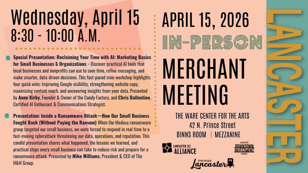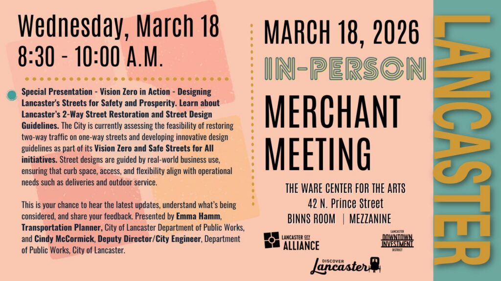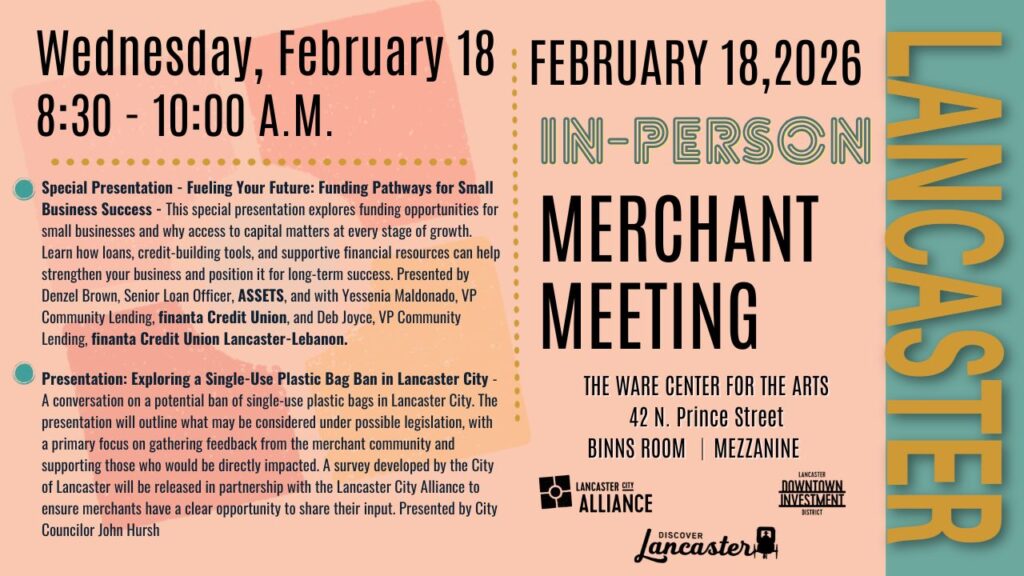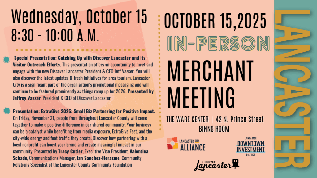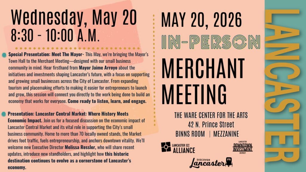Lancaster business owners and community organizations are invited to attend our Monthly Merchant Meetings on the third Wednesday of every month (Except December), 8:30 a.m. at The Ware Center, 42 North Prince Street. Get timely information for your business, engage with the community, and network with other businesses. RSVP: info@teamlanc.org